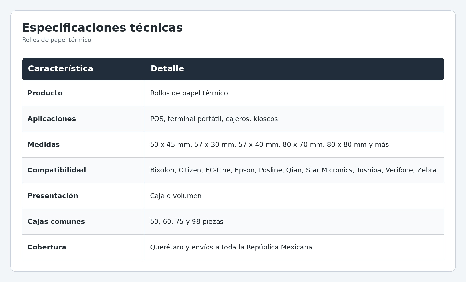 Podemos apoyarte con distintas medidas de rollos de papel térmico, incluyendo formatos comunes del mercado como: